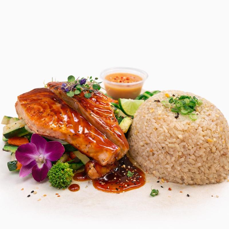 Served with vegetables (broccoli, onions, mushrooms, zucchini, and carrots) and fried or white rice.